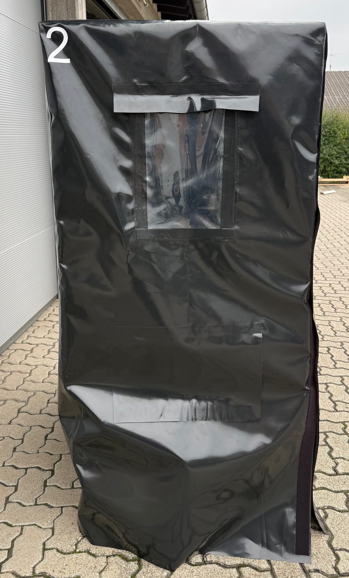 Schwarze, kundenindividuelle Hauben als Abdeckung für Metallcontainer- zum Aufklappen und mit Sichttasche, Staubschutz für Bremse seitlich und Nummerierung